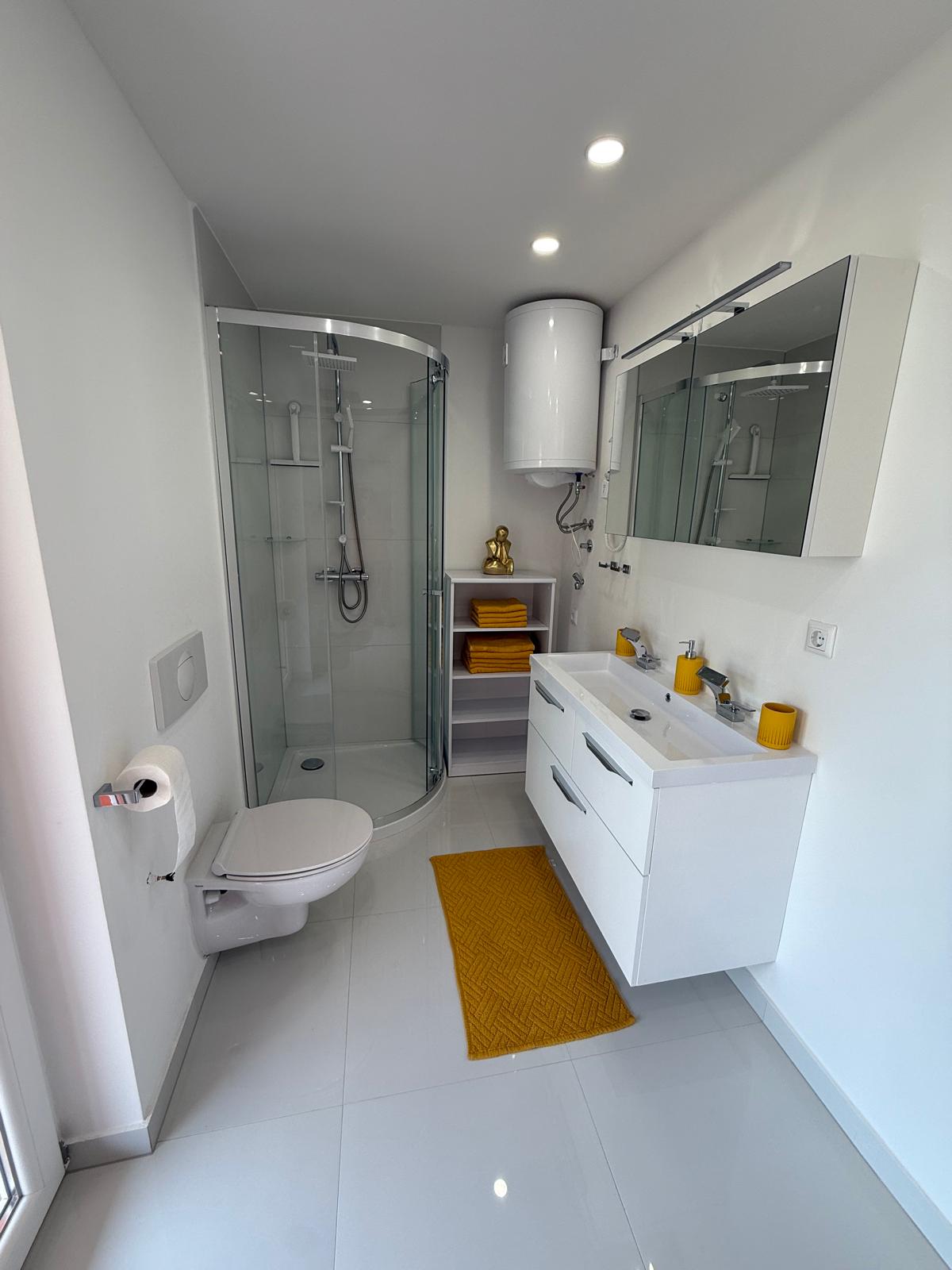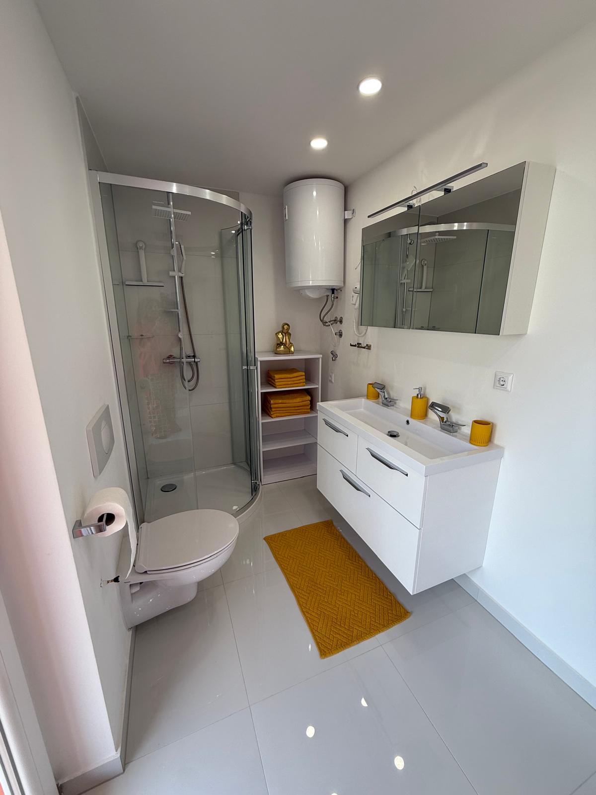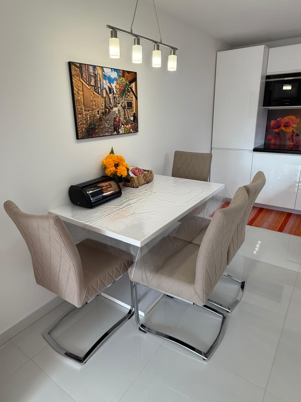 Felszereltség: klíma, wifi, TV, hűtő fagyasztó résszel, vízforraló, konyhai edények evőeszközök, főzőlap, mosogatógép, mikró, ágynemű, törölköző.