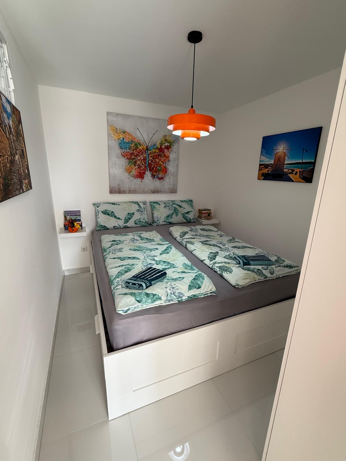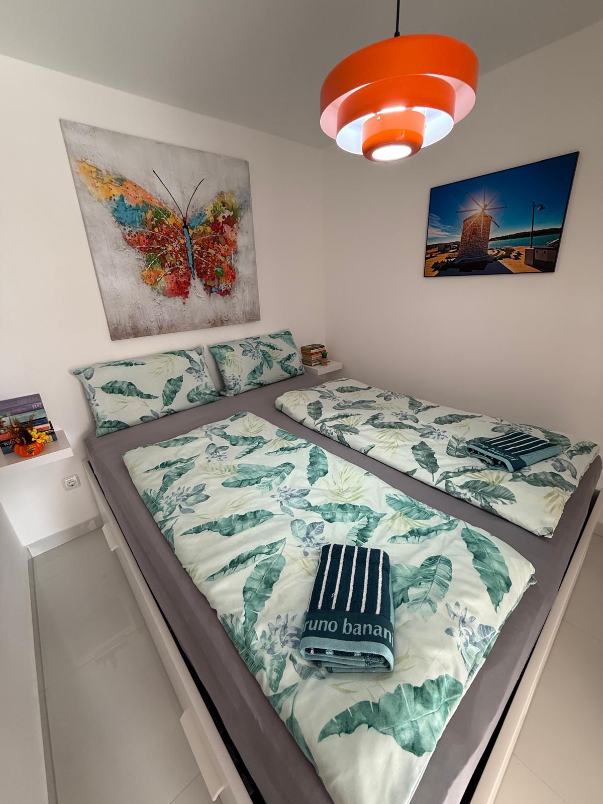 Az épületben 4 apartman található. Kilátás a tengerre! Az alsó szinten két nagyobb apartman. Kettő kisebb lakás pedig a felső szinten. A Luna apartman a földszinten található és 4 személy részére foglalható. Két hálószoba (2 franciaágy) + nappali (kihúzható kanapé)