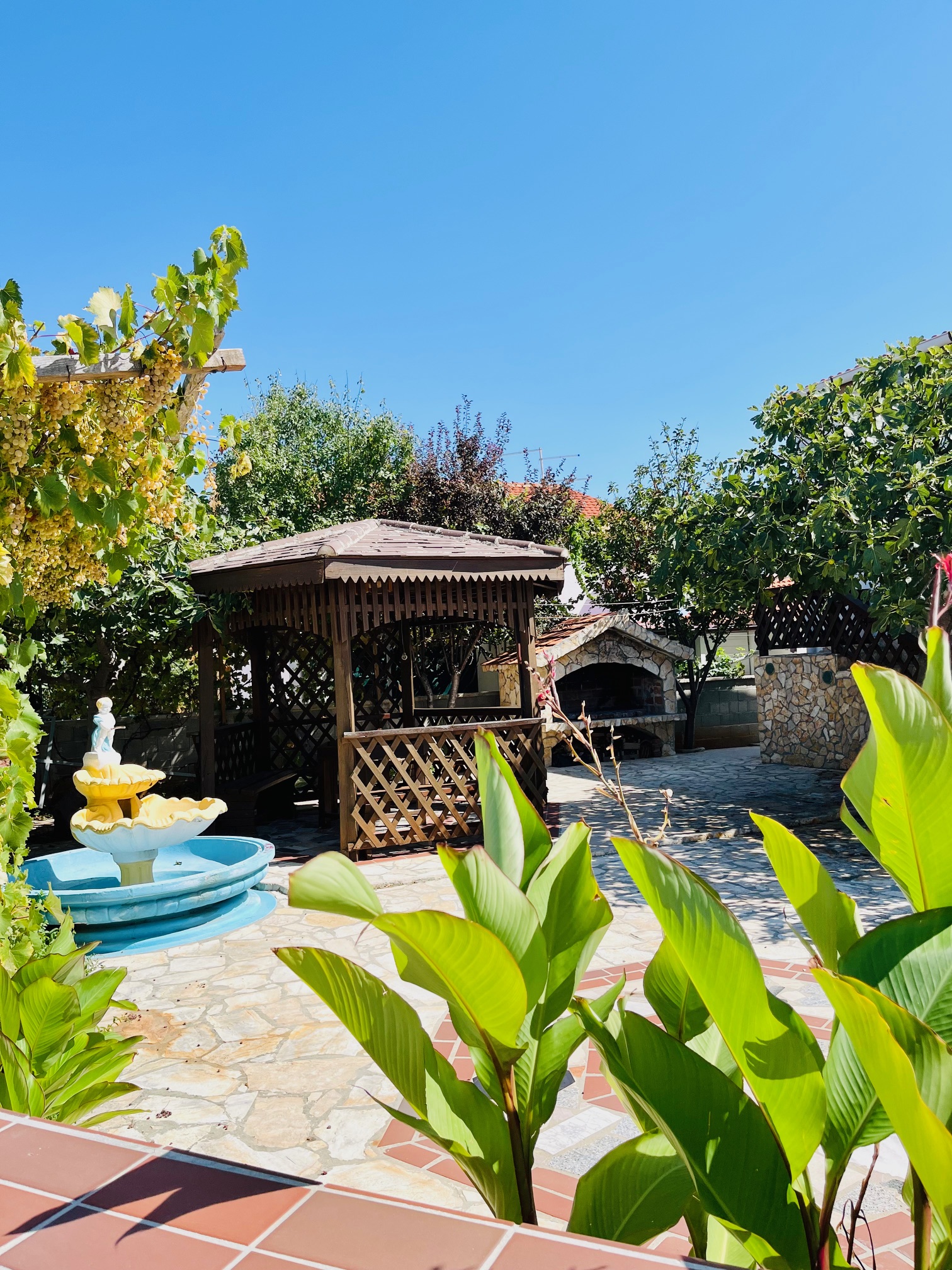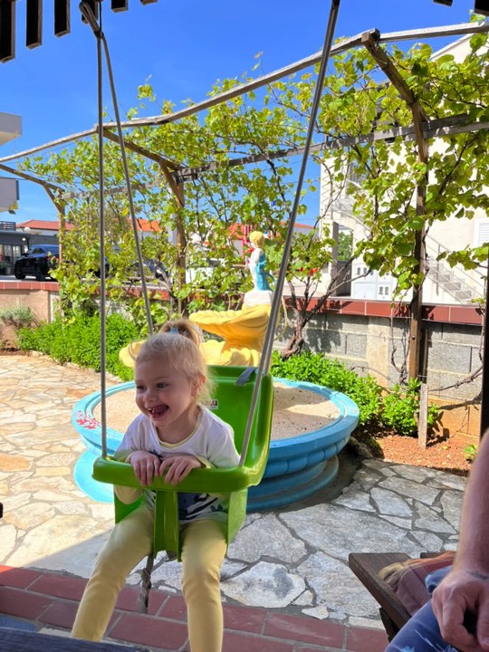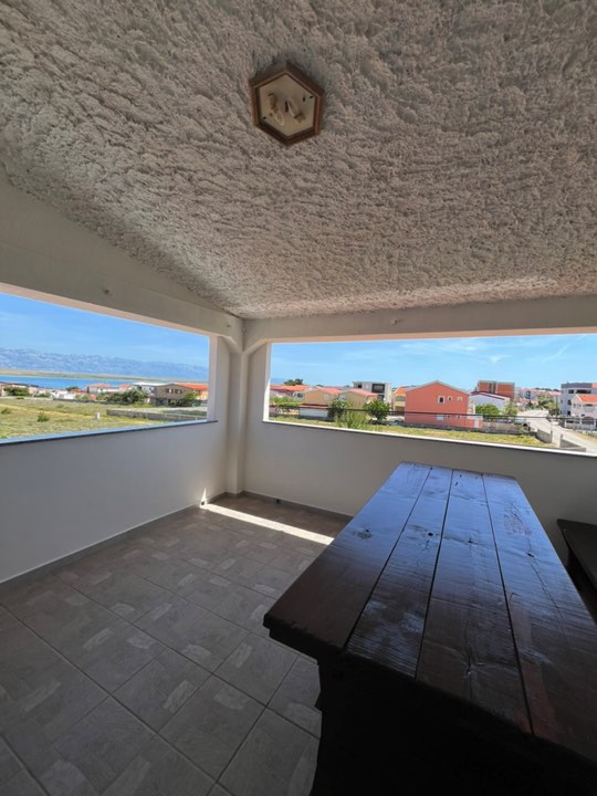 Felső szinten lévő apartman, mely két hálószobával (1 db franciaágy, 3 db egyszemélyes ágy) és egy nappalival rendelkezik. Öt felnőtt fér el kényelmesen. A teraszon a reggelit és a vacsorát kellemes hangulatban lehet elfogyasztani, kilátás a tengerre, az ablakok teljesen nyithatóak, vagy éppen zárhatóak, ha zivatar közeledne. Az udvaron egy árnyékos kerthelység grillezési lehetőséggel.