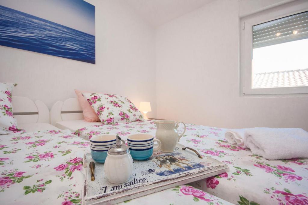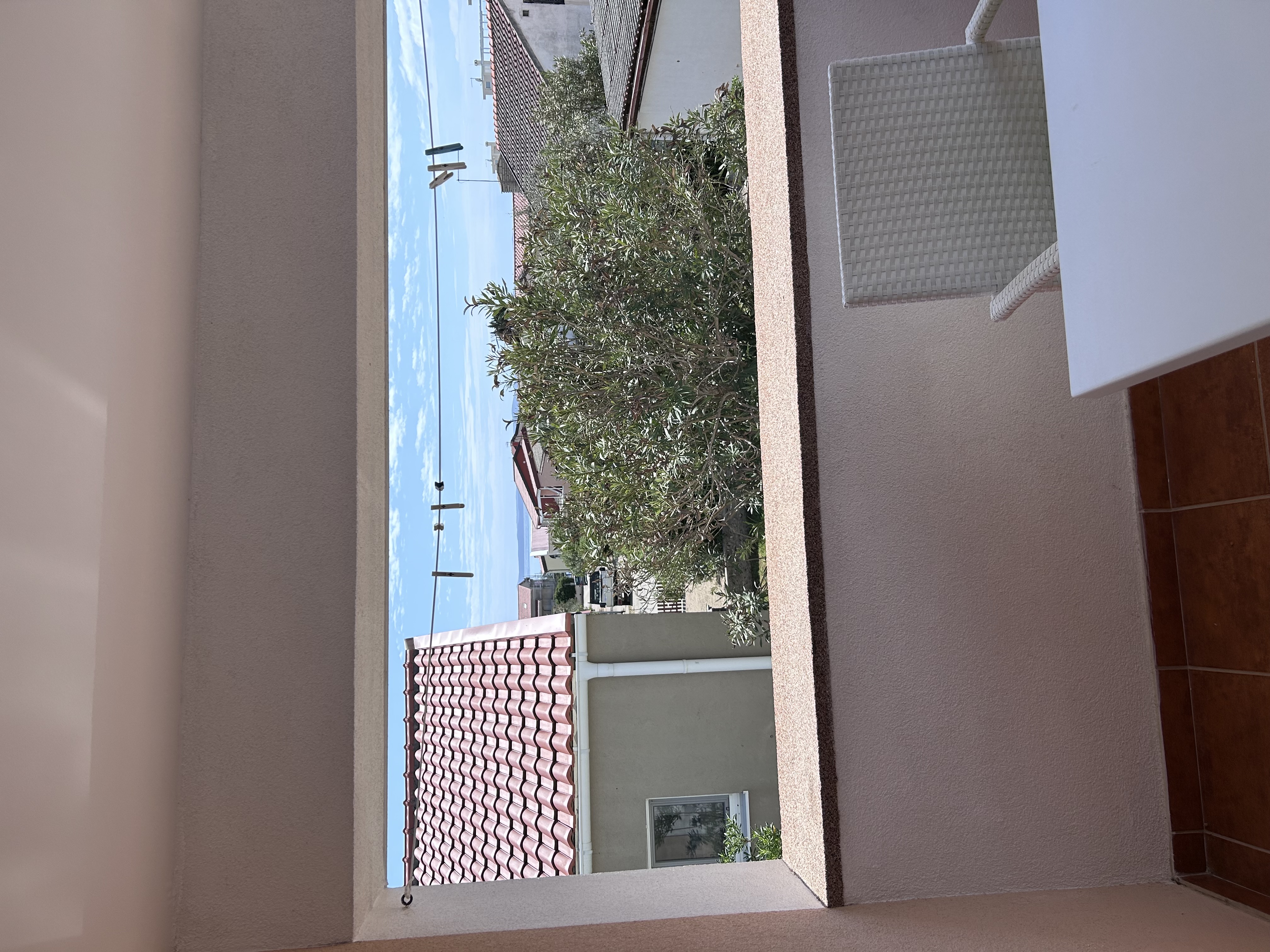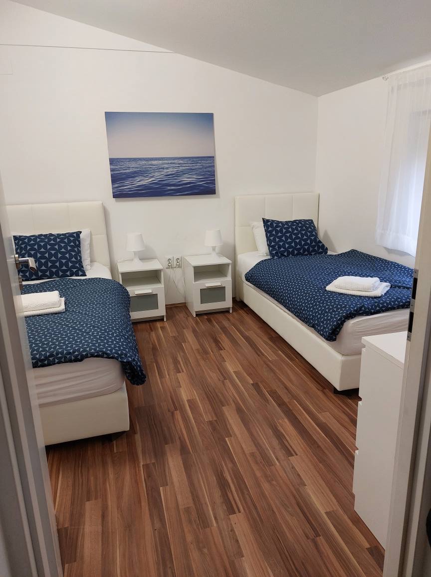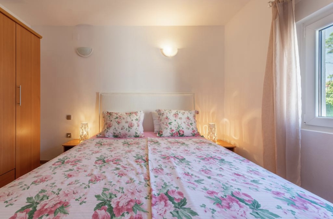Az apartman az épület felső szintjén található, mely két hálószobával (1 db franciaágy, 2 db egyszemélyes ágy) és egy nappalival rendelkezik. Négy személy fér el kényelmesen. A teraszon a reggelit és a vacsorát kellemes hangulatban lehet elfogyasztani. A terasz tágas és hűvös, elszeparált. Enyhe kilátással a tengerre.
